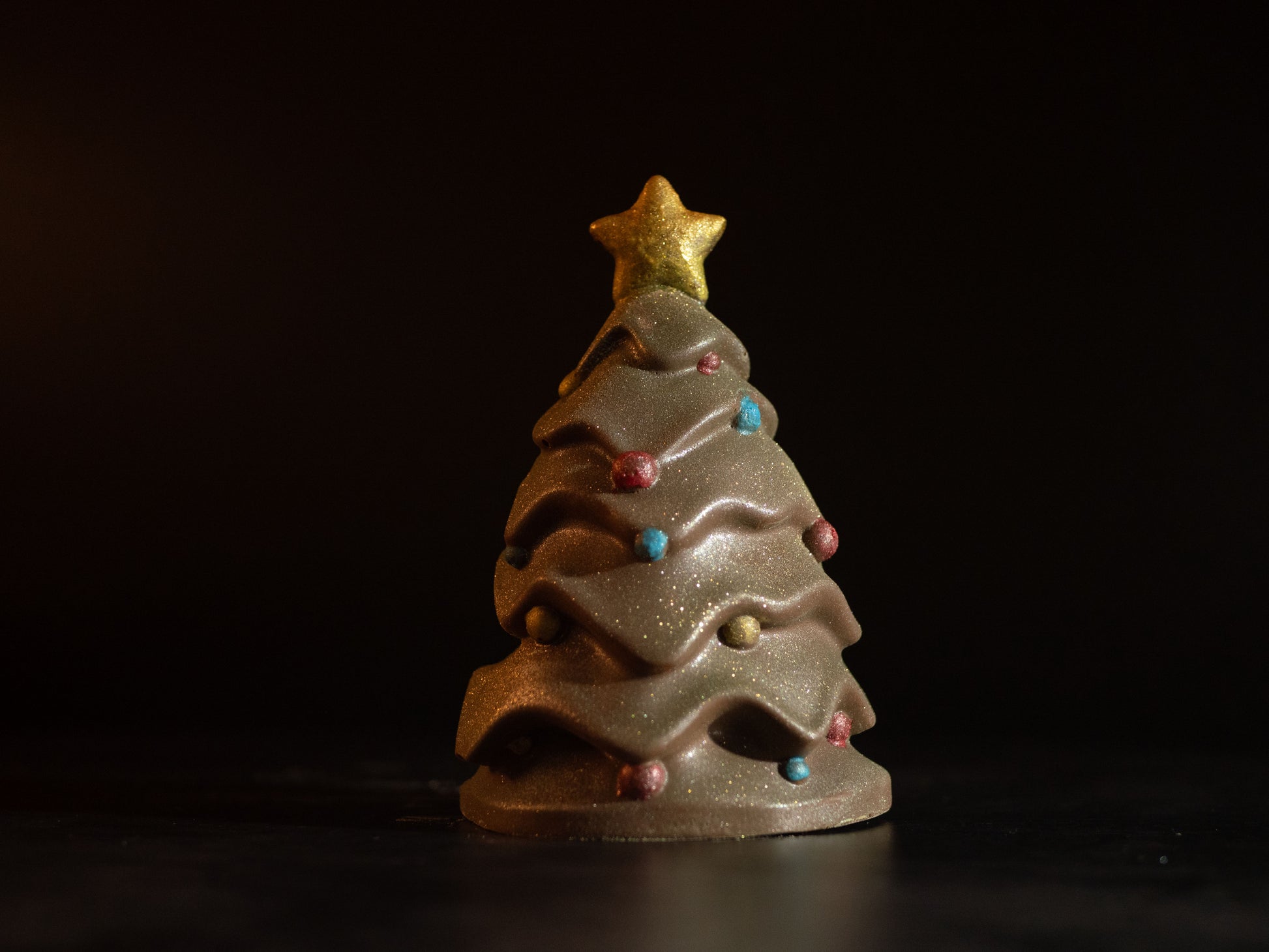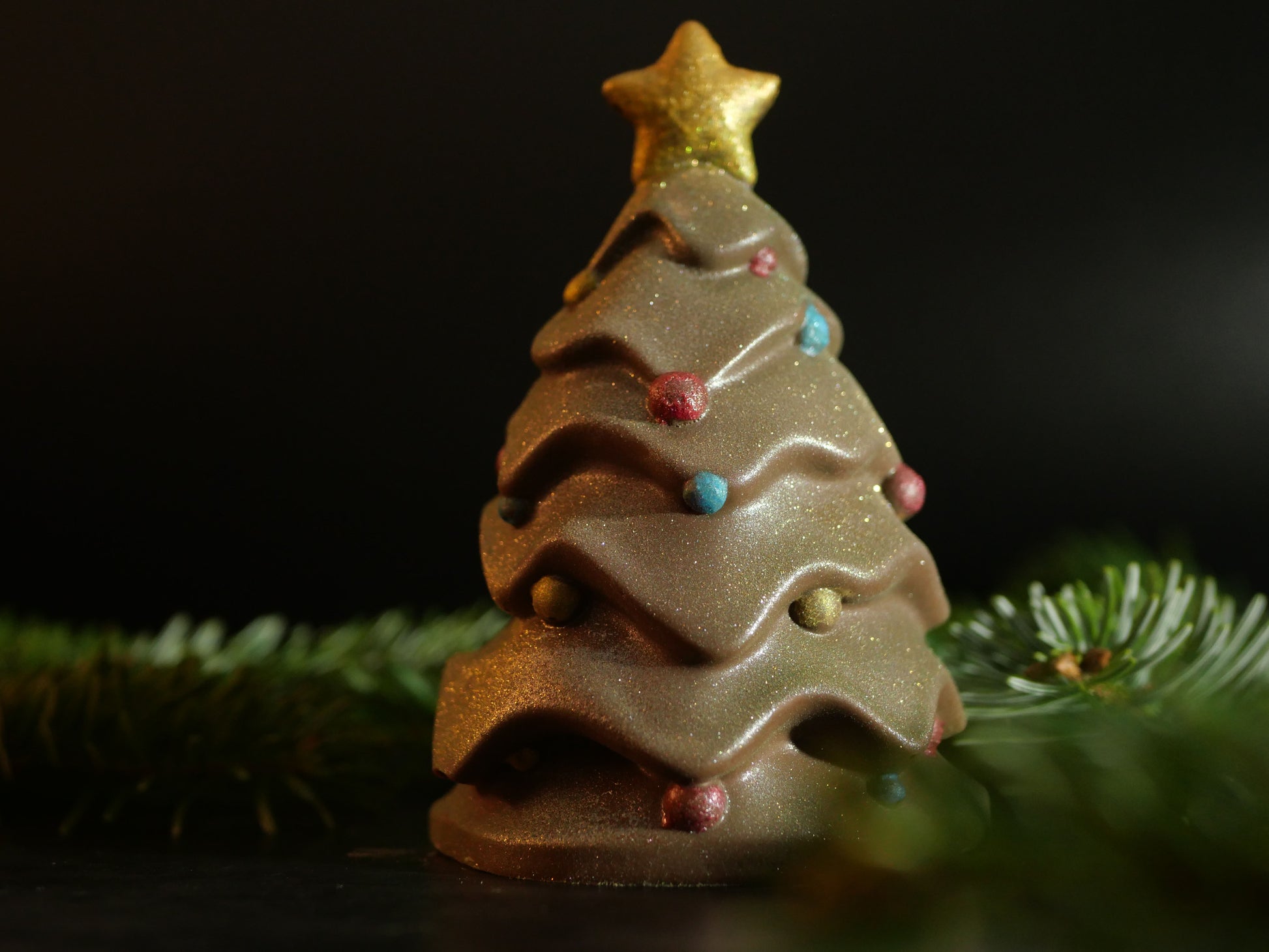 Exclusive 3D Christmas tree chocolate. Hand decorated with edible colours and glitter.